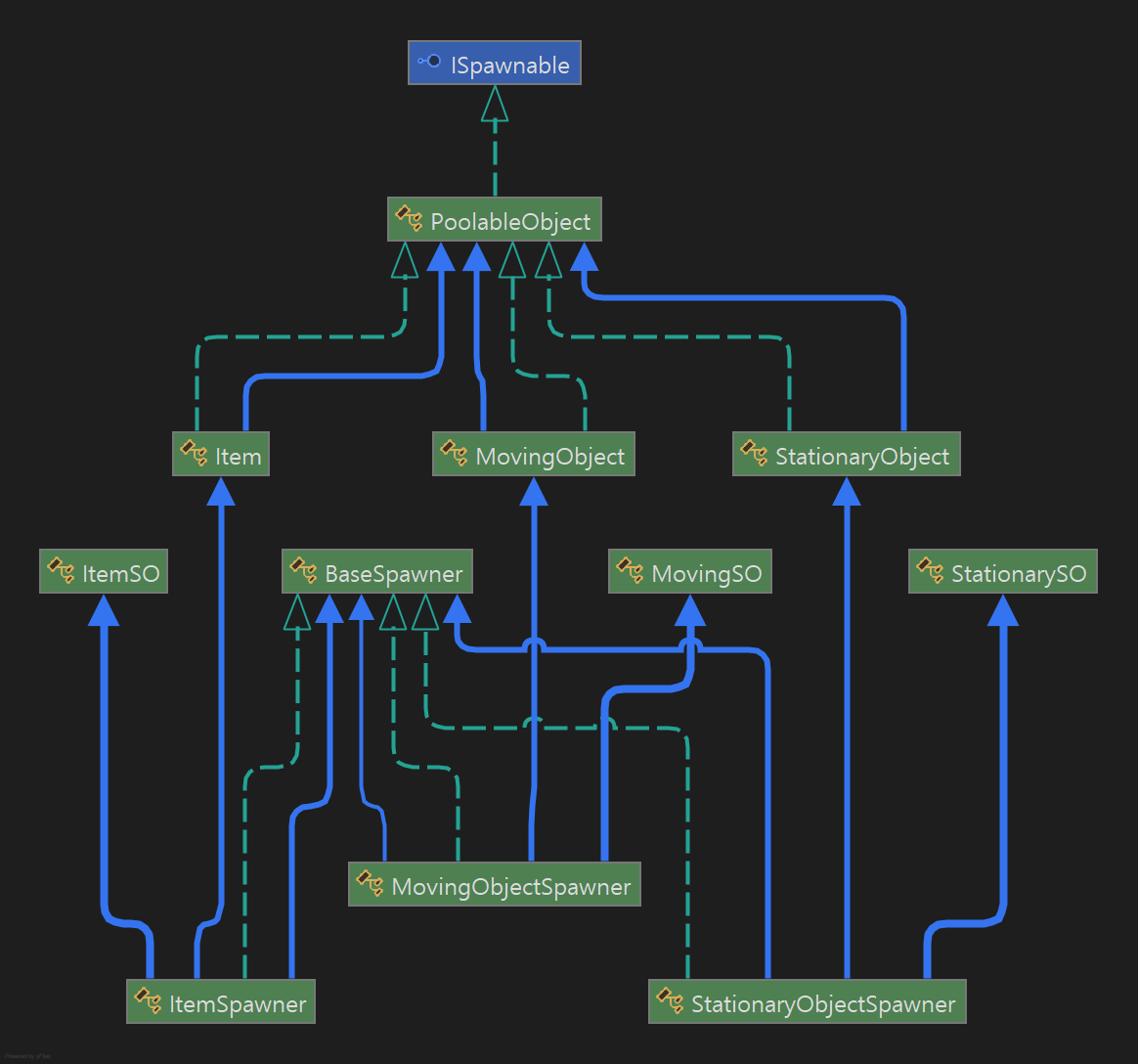 보다시피 Item, MovingObject, StationaryObject 모두 공통되면서도 다른 부분이 있는데 개별로 관리하고 있어 중복된 코드가 많으며 한눈에 들어오지 않는다. 특히 풀에 반환하는 시점을 코루틴으로 관리하고 있어 시간이 지나면 자동으로 반환되는 문제가 있다.